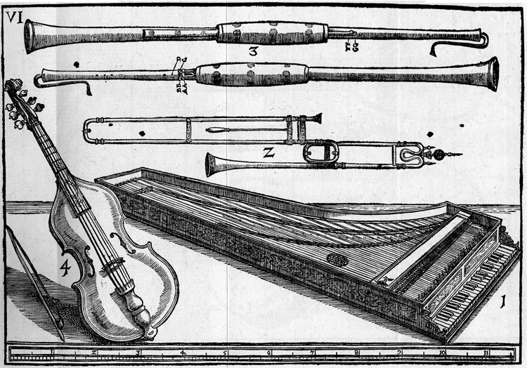 1619—Wolfenbüttel, Germany: Michael Praetorius, in his Syntagma Musicum III, writes enthusiastically about a mixed consort he says is in use in England: “The English quite appropriately refer to a consortio as ‘consort,’ when several people with assorted instruments, such as harpsichord [Clavicymbeln] or double harpsichord [Großspinet], large lyra viol, double harp, lutes, theorbos, pandoras, penorcon, cittern, violas da gamba, small discant violin [Geig], transverse flute or recorder, sometimes also a soft trombone or recorder, play harmoniously together, softly and sweetly in a charming ensemble (Praetorius-Kite-Powell III 19).