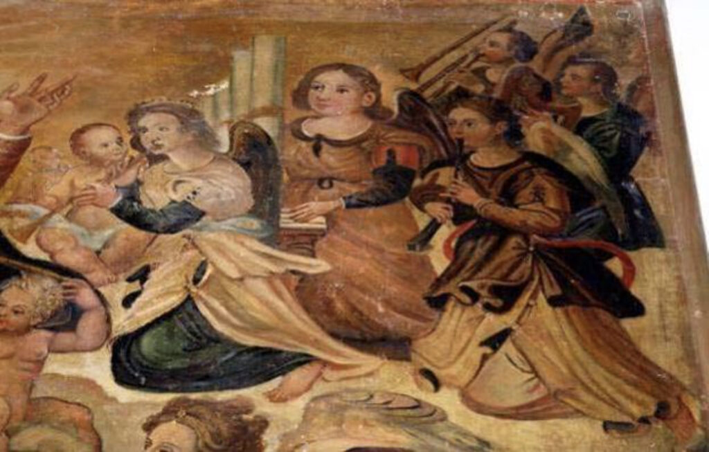 c. 1600—Giuseppe Bonfiglio’s Trinita con la Vergine e Ognissanti includes an angel trombonist (see below detail; public domain) (Museo Civico, Castroreale, Sicily).