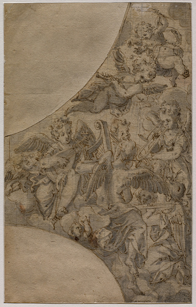 Late 16th century—Italy: Bolognese painter and engraver Francesco Brizio includes trombone among numerous angel-musicians in his study, Lunette with Musical Angels in the Clouds (see detail and full image, below; click picture for larger version; public domain) (Bohn 532).